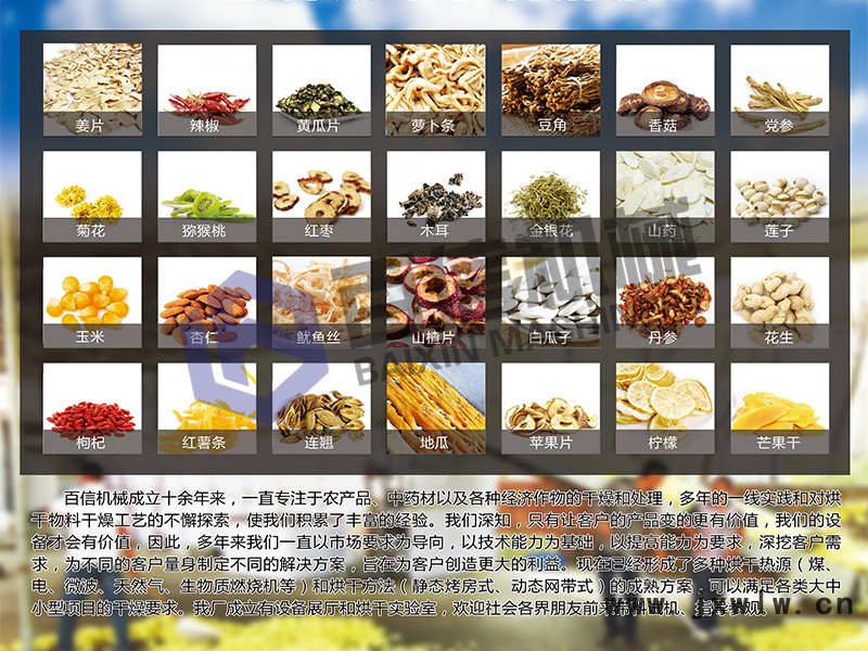 網(wǎng)帶式烘干機廣泛應(yīng)用于食品(如面條、面皮)、干果(大棗、巴旦木、腰果、開心果)、花茶(玫瑰花、菊花、金銀花、百合花)、農(nóng)副產(chǎn)品(如玉米、花生烘干袪潮)、脫水蔬菜(如大蒜、姜片、辣椒、辣根、洋蔥、蘿卜、生姜、小香蔥、辣根、菠菜)、瓜果(如木瓜、薯片、山楂片、葡萄干、哈密瓜)、中草藥、(連翹、黃蜀葵、枸杞、)水產(chǎn)品、土特產(chǎn)品、飼料及化工原料等加工之片狀、條狀、塊狀和顆粒狀物料的脫水干燥作業(yè)。
