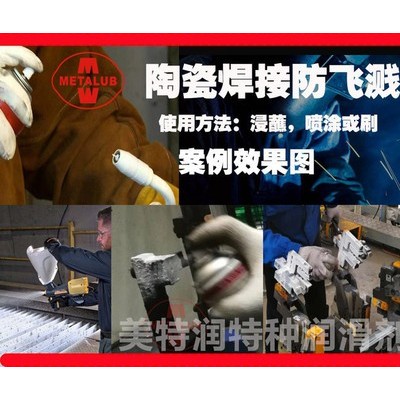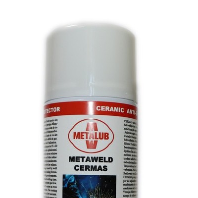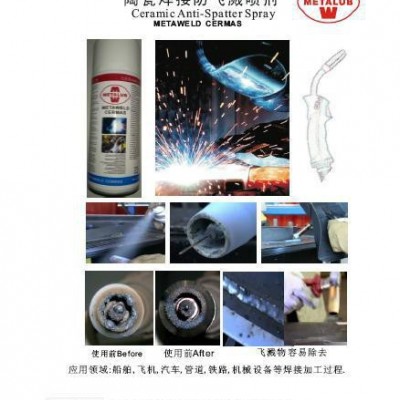 陶瓷焊接防飛濺噴劑 Ceramic Anti-Spatter Spray metaWELD CERMAS 焊接防飛濺噴劑Anti-Spatter防飛濺劑一般是指在焊接過程中防止被燒紅的金屬顆粒飛濺并粘附到附近的非焊接的部位。飛濺物濺到經(jīng)過防飛濺劑處理過的表面可以自然脫落,而不會(huì)結(jié)成難以清理的附著物,從而起到保持非焊接部位的作用 Ceramic Anti-Spatter Spray metaWELD CERMAS has been specifically designed to protect welding consumables, equipment and fixtures and fittings from spatter problems.Ceramic Ceramic Anti-Spatter Spray metaWELD CERMAS over long periods of time. The product is supplied in aerosol form and is simple to apply.Ceramic Anti-Spatter Spray metaWELD CERMAS prevention spray-coating, designed to extend the life of contact tips and shrouds in industrial semi-automated and robotic MIG/MAG welding applications, including heavy equipment fabrication and vehicle production. Ceramic Anti-Spatter Spray metaWELD CERMAS out-performs regular anti-spatter sprays and increases productivity, reducing downtime by minimising tip and shroud changes. Typically, Ceramic Anti-Spatter Spray metaWELD CERMAS coated shrouds last over twice as long as uncoated shrouds before spatter build-up adversely affects welding performance. In many applications, only a sinlge application of Ceramic Anti-Spatter Spray metaWELD CERMAS is required per shift, which removes the needs for reaming stations and tip-dip. The spray can also be applied to jigs, fixtures and power cables to protect them from spatter damage. Ceramic Anti-Spatter Spray metaWELD CERMAS is an anti-spatter with rapid drying ceramic coating providing exceptional protection of welding equipment and welded parts from damage caused by spatters. Ceramic Anti-Spatter Spray metaWELD CERMAS boost your productivity and reduce costs Ceramic Anti-Spatter Spray metaWELD CERMAS Fast drying,long lasting and durable ceramic coating formulated to withstand the most demanding requirements in the professional welding environment. 焊接陶瓷防濺劑metaWELD CERMAS是快干型焊接防濺劑,能夠持久提供一層陶瓷膜,保護(hù)不受焊接設(shè)備和焊件 不受飛濺損傷,滿足高要求焊接。 Ceramic Anti-Spatter Spray metaWELD CERMAS lasts 8 consecutives hours welding working (1 working day/shift), without any further adds of product. 連續(xù)8小時(shí)持續(xù)保護(hù)。