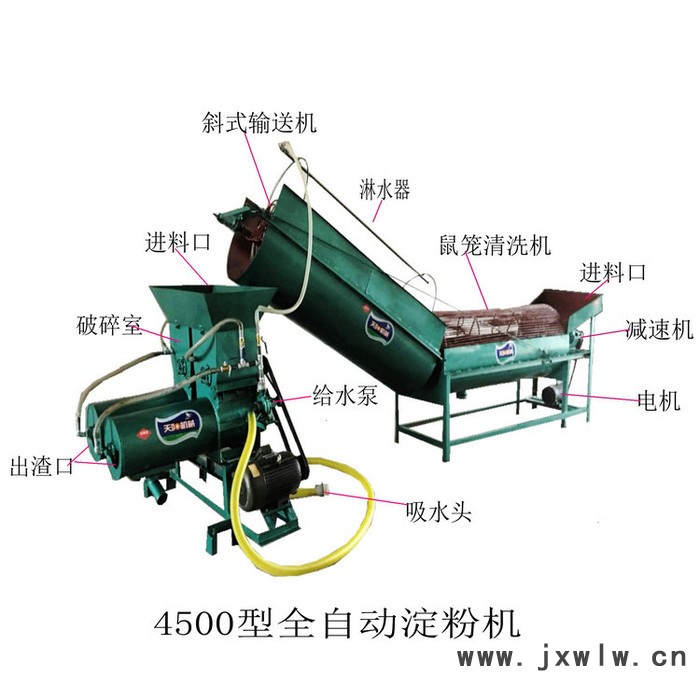 全自動轉(zhuǎn)籠洗薯紅薯淀粉機由轉(zhuǎn)籠洗薯輸送機和淀粉漿渣分離機是天陽機械公司綜合國內(nèi)外制粉設備的優(yōu)點研制生產(chǎn)的的適合于農(nóng)戶加工使用、投資較小的一種馬鈴薯、紅薯、芭蕉芋、木薯、葛根、蓮藕等制粉設備,結(jié)構(gòu)緊湊,占地面積小,易操作,用人少,一般場地或農(nóng)家院中即可生產(chǎn)。全自動轉(zhuǎn)籠洗薯紅薯淀粉機采用洗薯機清洗,有效保證薯塊不破損,淀粉不流失自動化程度高,從鮮薯清洗、輸送、破碎到渣漿分離自動完成。粉碎和分離連續(xù)進行,避免了淀粉提取過程中的氧化褐變,生產(chǎn)出的淀粉潔白細膩紅薯土豆淀粉機全自動淀粉加工成套設備能耗低、省水、省電、加工費用低,采用猬式刺釘輥碎薯溢流濾粉新工藝,鮮薯通過高速旋轉(zhuǎn)的刺輥碎解成絲狀,再經(jīng)兩級沖水淘洗,不堵塞過濾網(wǎng)孔,使淀粉和纖維分離徹底,從而提高淀粉的提取率,同時水可循環(huán)使用,節(jié)約了用水。使用時薯藕由料斗緩緩洗薯機轉(zhuǎn)籠內(nèi),通過轉(zhuǎn)籠緩慢運行,清水浸泡,薯藕等在旋筒中一方面沿筒壁作圓周運動,一方面沿軸線作直線運動,加長了清洗距離,薯藕洗凈度高,并可部分去皮。泥沙、石塊、皮渣通過殼底排污口自動排出,洗好的薯藕再經(jīng)螺旋上料機輸送到出料口進入淀粉機中粉碎加工即可。
