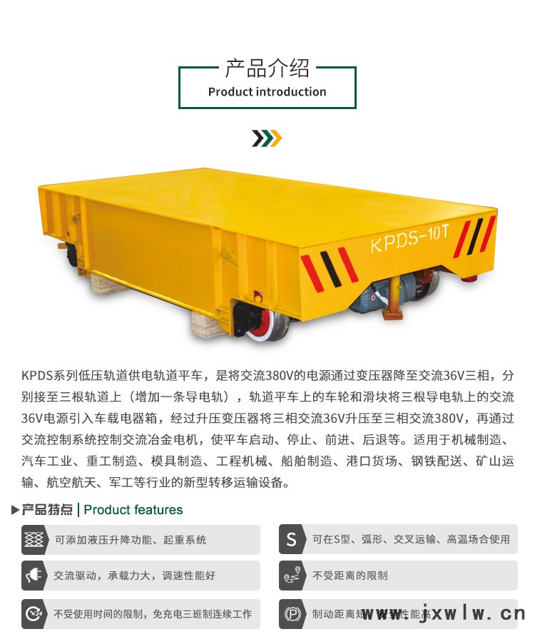 3、KPDS系列軌道平板車臺(tái)面平整度較高,結(jié)構(gòu)緊湊,成本較低,由于不用線纜,靈活性和機(jī)動(dòng)靈活性更強(qiáng)。
