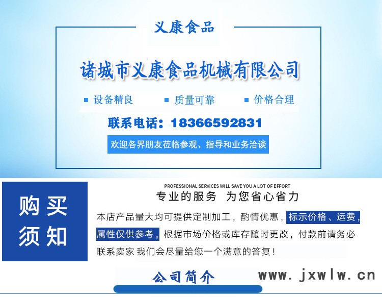 諸城市義康食品機械有限公司,位于山東省諸城市。是專業(yè)從事肉類加工機械開發(fā)、設計、制造及銷售的現(xiàn)代化企業(yè)。以生產食品機械為主,專業(yè)從事斬拌機,滾揉機,灌腸機,鹽水注射機,煙熏爐、刨肉機,肉丸機,丸子機,禽類切塊機、 拌餡機,活化嫩化機,刨肉機,豬頭劈半機,豬蹄劈半機,風干機、絞肉機、魚肉采肉機、真空包裝機、扎線機、凍肉切塊機、解凍機、油炸機、蔬菜清洗機,毛刷清洗機,洗筐機、餐具清洗流水線、滾筒清洗機、滾筒拌料機、滾筒風干機、千頁豆腐加工設備、千葉豆腐切絲機、魚豆腐加工設備:斬拌機、灌裝機、裝盤機、蒸煮箱、切塊機、切片機、不銹鋼盤子、小料車、工作臺、肉類燒毛機等。產品行銷全國各地,現(xiàn)已擁有各類機械加工設備,能夠滿足不同層次用戶的需要。義康技術、精良的加工和檢測設備,可靠的制造質量、嚴密的質量保證體系和更完善的售后服務,贏得了越來越多的顧客。信用和真誠是企業(yè)的財富,我們以真心對待每一位已經或將要成為我們顧客的您?!傲x康”能為您提供完善的售前、售中、售后全過程、全方位服務。在提升產品質量的同時,不斷地提升服務質量,為推動食品加工行業(yè)迅速發(fā)展而努力。 |