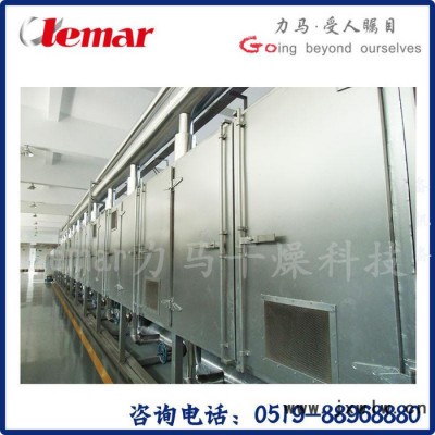 其基本原理是將所要處理的物料通過(guò)適當(dāng)?shù)募恿蠙C(jī)構(gòu)(如星型布料器、擺動(dòng)帶、粉碎機(jī)或造粒機(jī)),分布在輸送帶上,輸送帶通過(guò)一個(gè)或幾個(gè)加熱單元組成的通道,每個(gè)加熱單元均配有空氣加熱和循環(huán)系統(tǒng),每一個(gè)通道有一個(gè)或幾個(gè)排濕系統(tǒng),在輸送帶通過(guò)時(shí),熱空氣從上往下或從下往上通過(guò)輸送帶上的物料,從而使物料能均勻干燥。利用蒸汽、導(dǎo)熱油、電或熱風(fēng)爐作為熱能源,有蒸汽散熱器、電加熱元件或熱風(fēng)爐產(chǎn)生熱量。利用風(fēng)機(jī)進(jìn)行對(duì)流換熱,對(duì)物料進(jìn)行熱量傳遞,并不斷補(bǔ)充新鮮空氣和排出潮濕空氣。干燥時(shí)間內(nèi)能保持適當(dāng)?shù)南鄬?duì)溫度和濕度,其**是大部分熱風(fēng)在箱內(nèi)進(jìn)行循環(huán),合理排濕,達(dá)到**的干燥效果,節(jié)約了能源。
